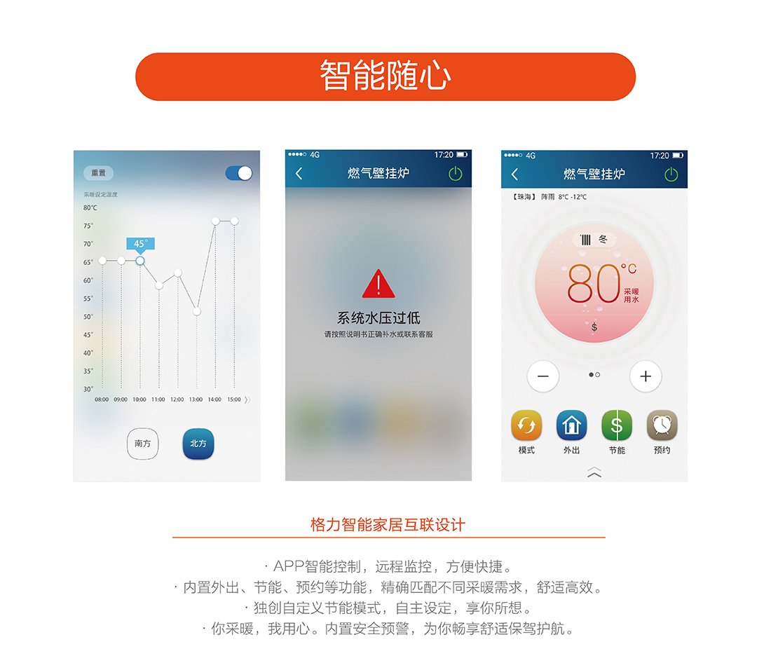 全預混燃燒結合雙寬域功率調節,節能恒溫,溫差在±0.5℃之間,保證熱水四季恒溫快速出熱水,減少水流浪費,生活水溫度35-60℃,采暖水溫30-80℃