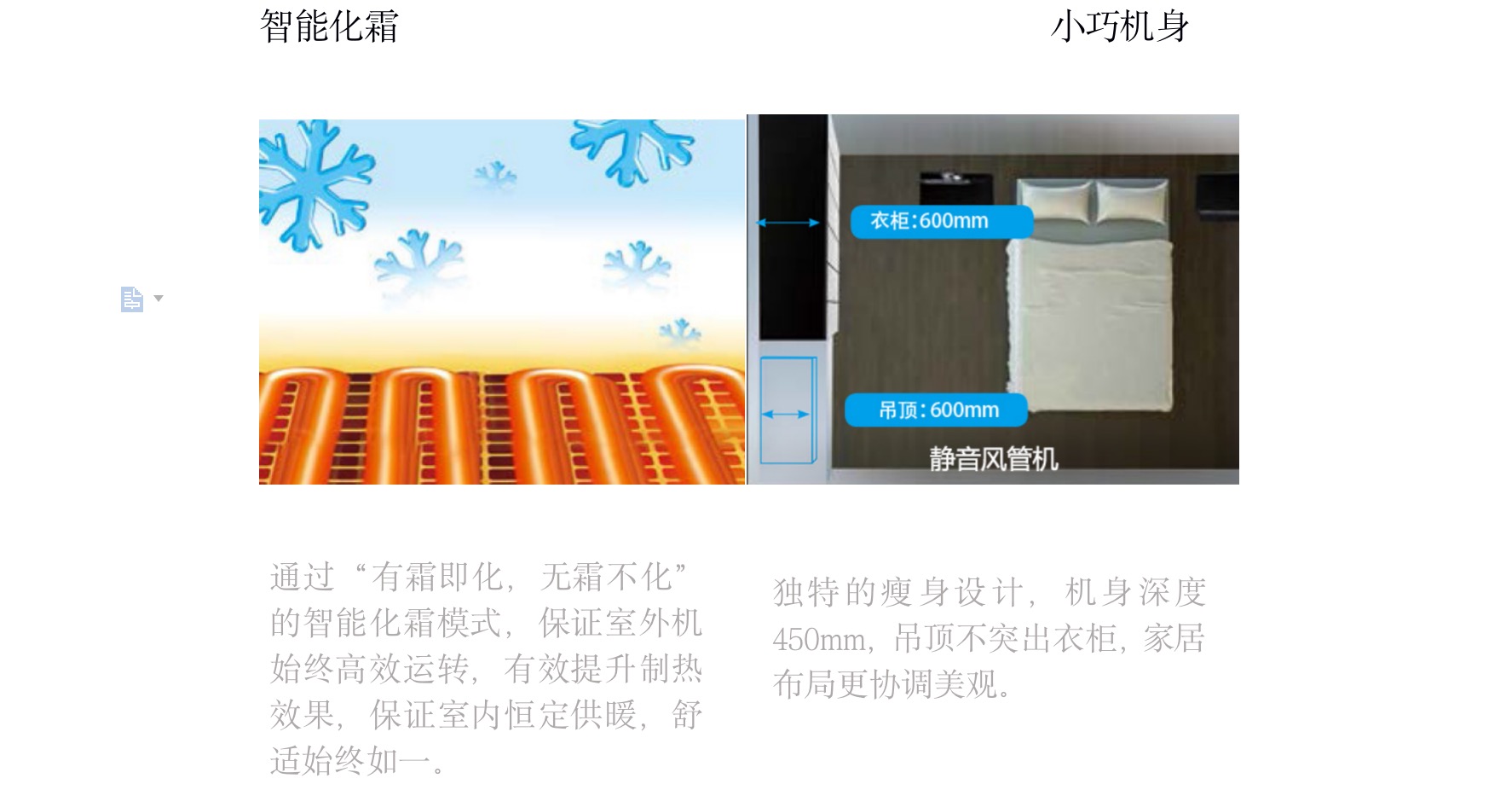采用“V”型換熱器,開機初期,根據(jù)室內(nèi)溫度與設(shè)定溫度自動調(diào)節(jié)至高頻狀態(tài),縮短制冷或制熱時間,提升舒適度